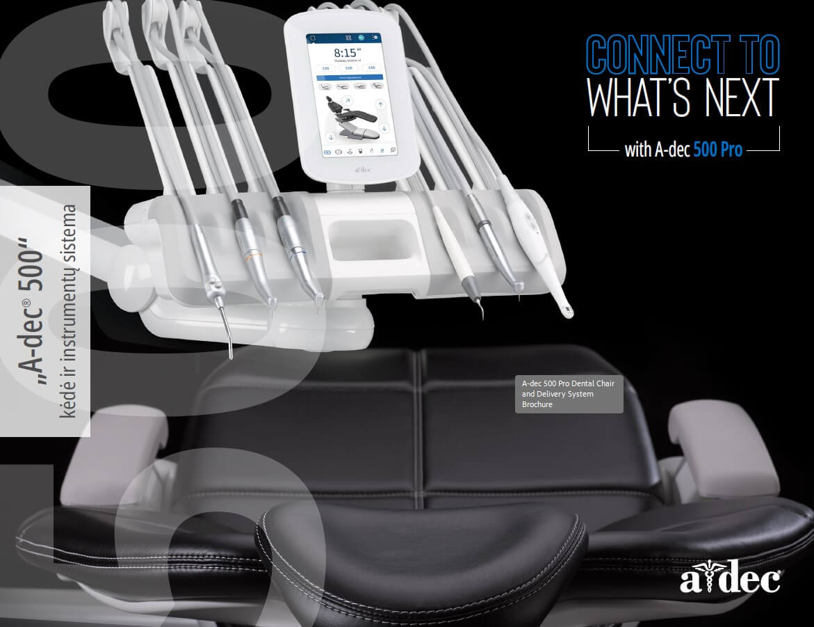Legendinės kokybės ir patogumo paciento kėdė „A-dec 500” dabar turi naujo modelio instrumentų valdymo sistemą „A-dec 500 Pro” su prisilietimams jautriu ekranu DS7 ir programinės įrangos platforma „A-dec+”.